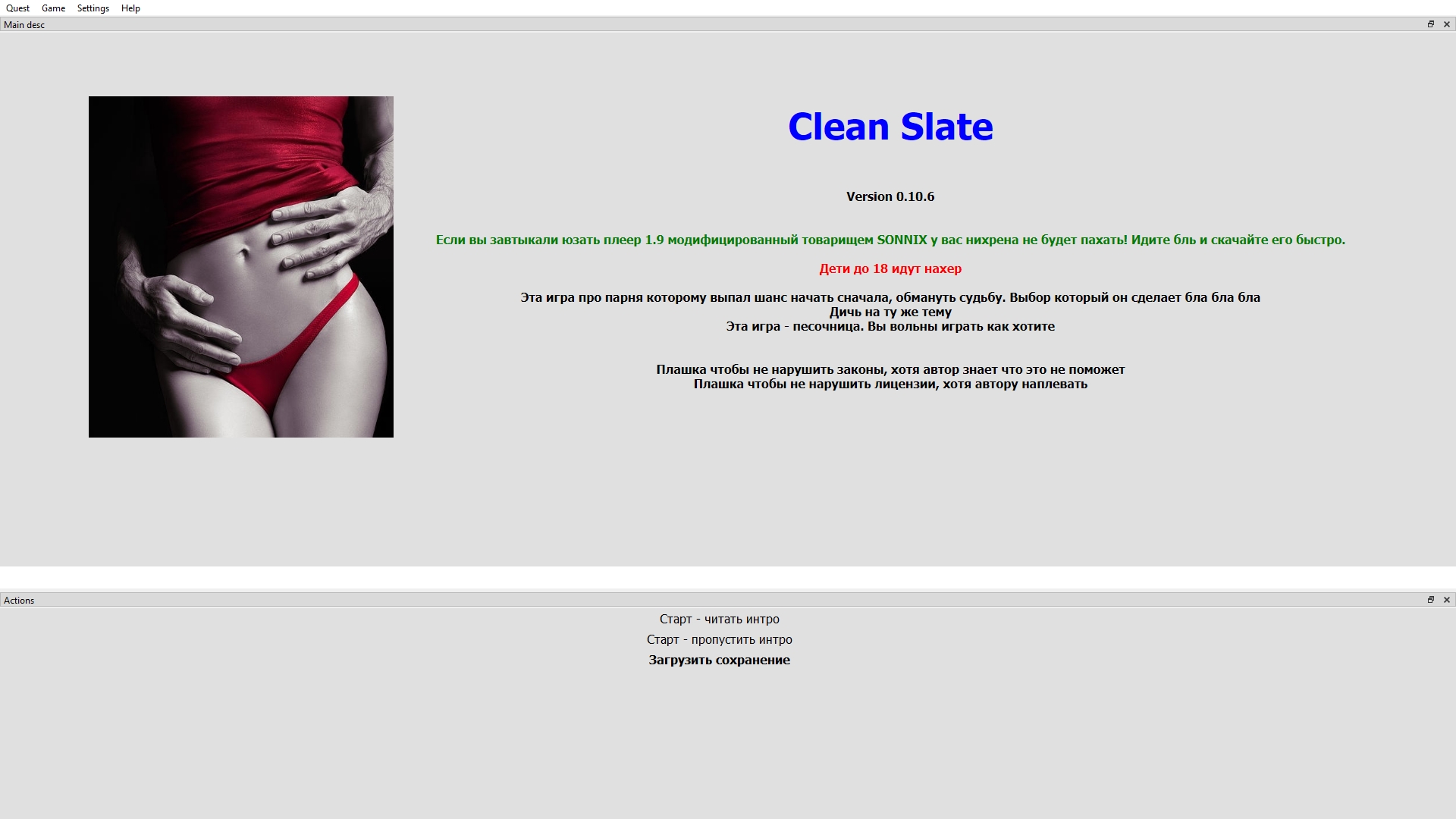 '<center><font color="GREEN"><b> IF YOU ARE NOT USING THE 1.9 QSP PLAYER BY SONNIX THEN YOU''RE GONNA HAVE A BAD TIME. GO GET THE RIGHT VERSION.</b></font>'